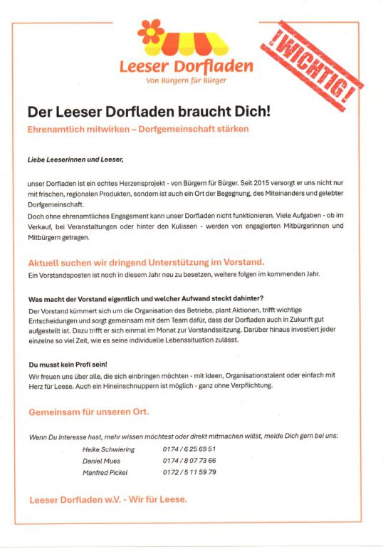 oder senden Sie eine E-Mail an info@leeser-dorfladen.de
